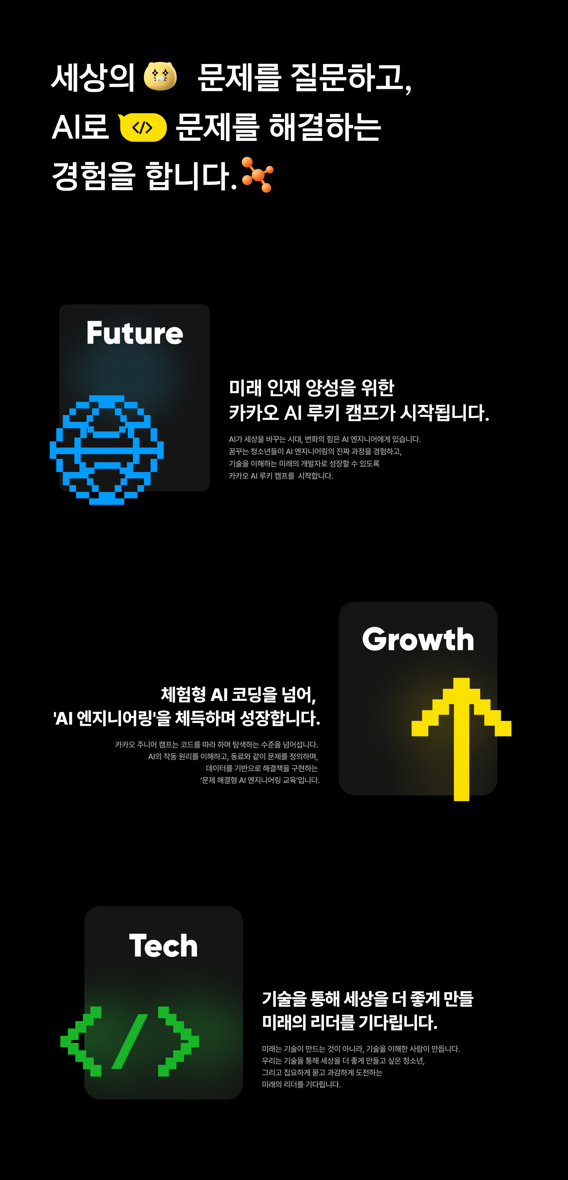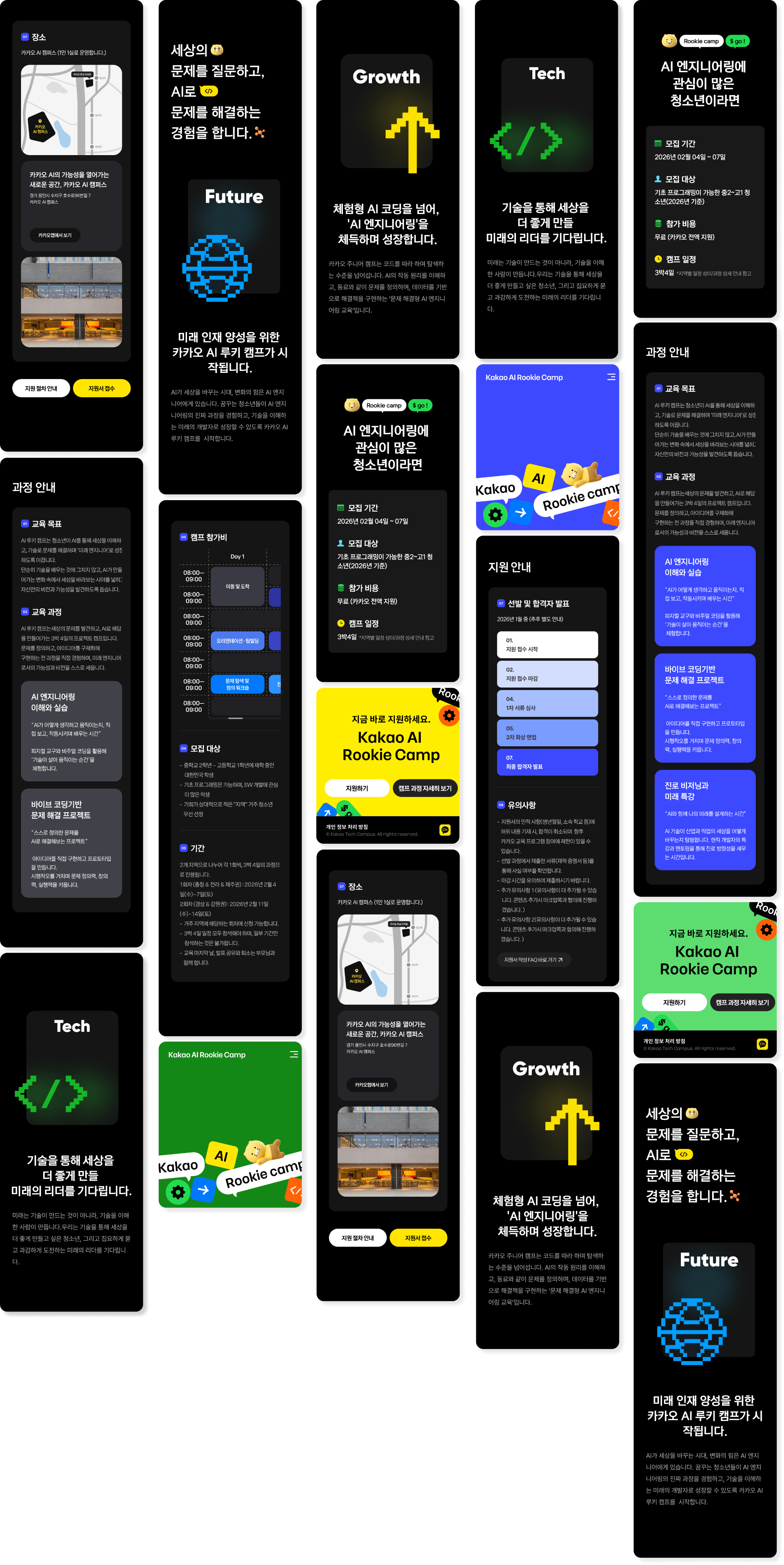 친근한 디자인 무드를 유지하되 컨텐츠 배경 컬러는 Black 감성이 어울렸습니다. Kakao Rookie Camp의 핵심 가치인 Future, Growth, Tech를 심플한 디자인과 레이아웃으로 정리 하였습니다.