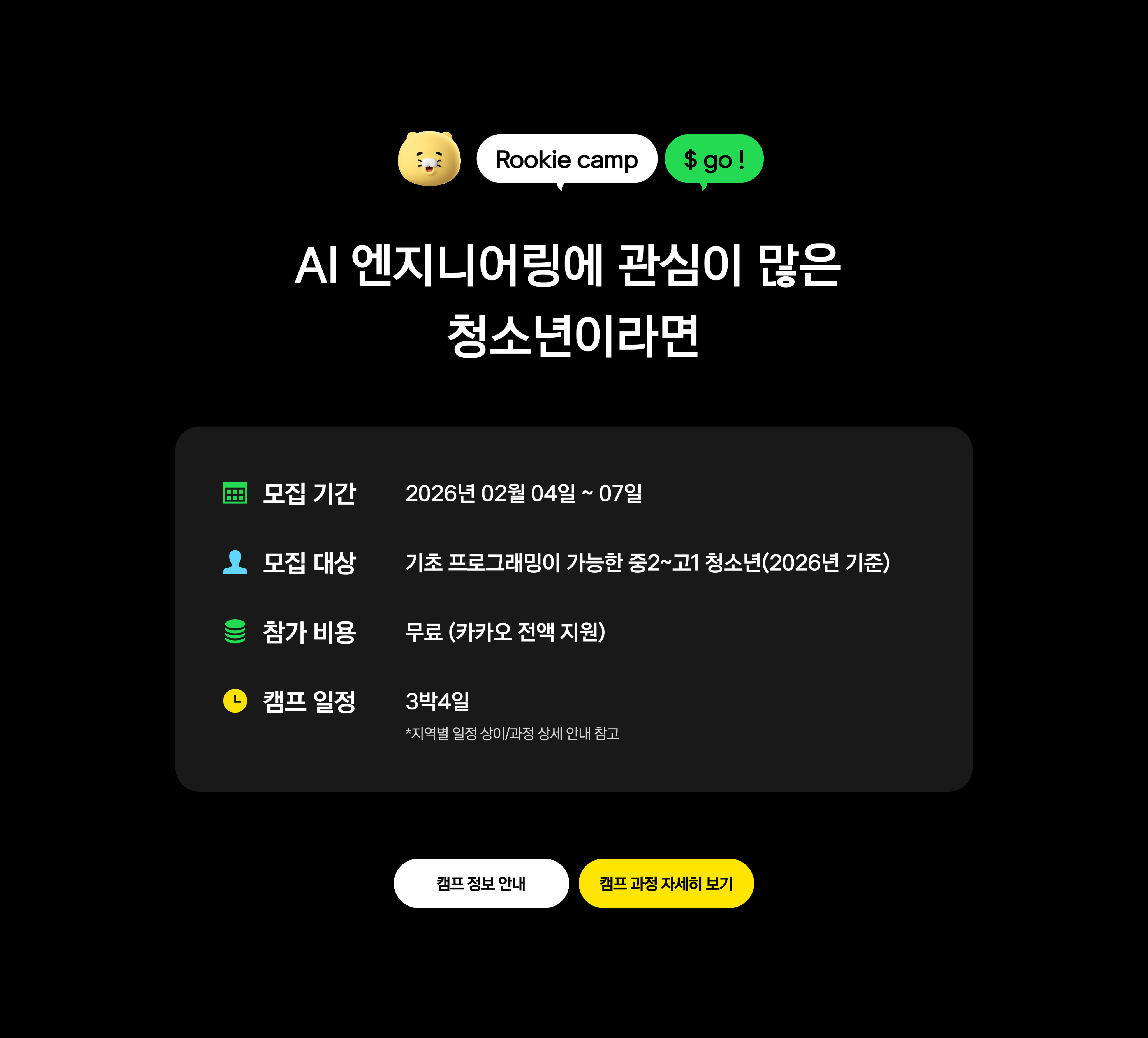 Kakao ESG가 주관하는 청소년 AI 교육 행사 ‘카카오 AI 루키 캠프'의 성공적인 개최를 위해, 행사의 핵심 가치를 전달하고 참가자 모집 및 안내를 돕는 공식 홍보 웹사이트 구축 프로젝트를 수행하였습니다.