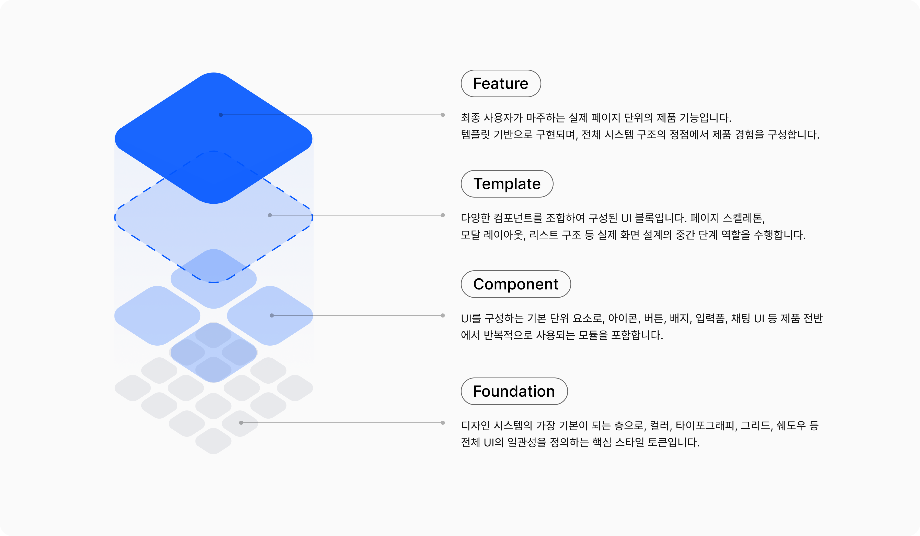 카카오워크 디자인 시스템은 계층 구조를 기반으로 구성되어 있으며, 각 레이어는 상위 구조의 기반이 되는 요소로 유기적으로 연결되어 있습니다. Foundation→ Component→ Template→ Feature로 점진적으로 확장되며, 기초 요소들이 모여 실질적인 화면과 기능으로 완성되는 구조입니다.